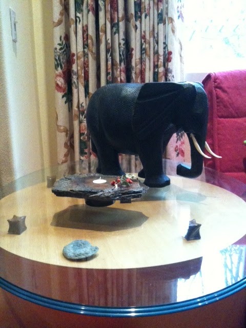 We still have the ebony elephant given us for a wedding present, though the tusks got lost in a move and we have bone replacements. W brought a candle stone in MT at an art fair. I can't remember where the fossil was found. Currently they grace a drum table, its Freecycle beveled glass topper resting on five Thai wooden massage knuckles.