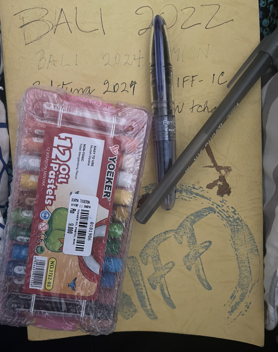 We buy rice (sembako), household paint, and cheap art supplies. 60c for oil pastels seems a worthy investment. I grab the blank notebook that I sketch or write in when we travel. No matter whether or not I draw or paint, I always write. I refill my fountain pen and tuck it away for the next trip.