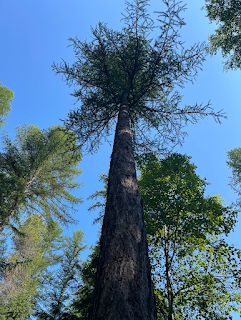 W's leaving to cabin to stroll to the wifi spot. He's taking my computer along when I reach the midway point of my walk: our cabin. I go along and catch up on the morning news. It's amazing how fast the trees have grown around the cabin ... and how tall the trees can get. The firs can reach 80-100 feet (25-30 meters).