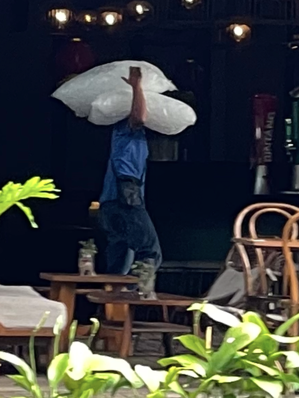 W and I walk before our breakfast date at #narapark. This young man carries bags of ice to the restaurants at Nara. We can't imagine how cold his arm and shoulder must be!